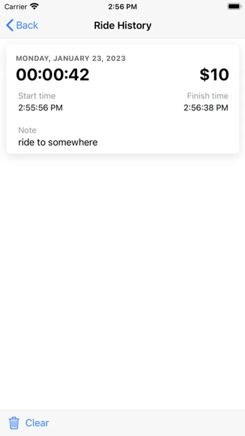 The user can also add Notes to their rides. When a ride is completed total time and cost based on user settings is displayed. Completed rides are easily reviewed in History.