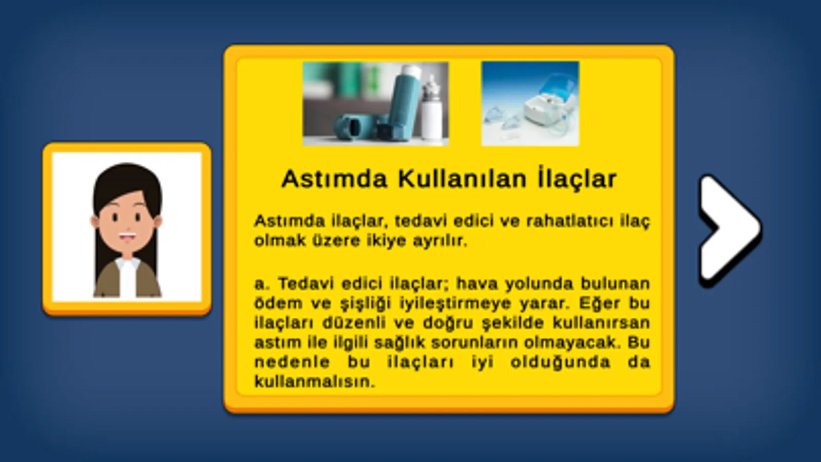 Astım maceram uygulaması sizi modüler videolar ve kısa, interaktif oyunlar ile astım hakkında bilgilendirecektir. Program, astım ve astım yönetimi hakkında önemli bilgileri öğretecektir. Astım tanımı, belirtileri, astımı tetikleyen faktörler, astım tetikleyicileri, ilaçların kullanımı, astım krizinde ilk yardım konularını içermektedir.