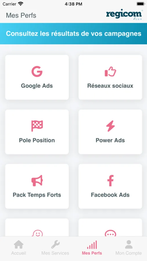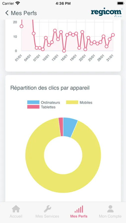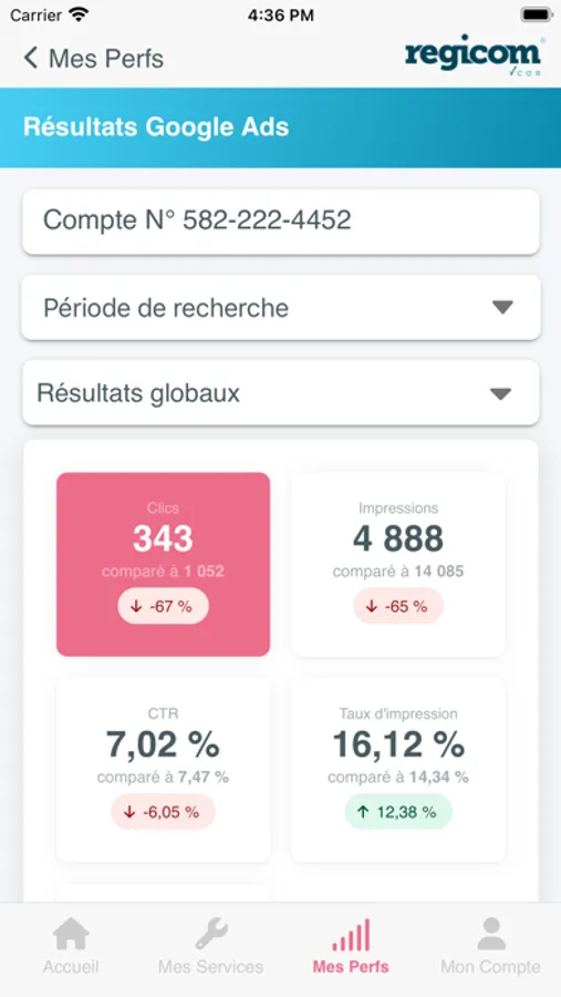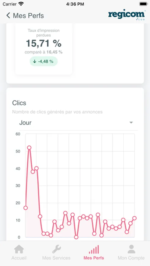 Consultez les performances de vos produits et campagnes Regicom, et mesurez en temps réel votre visibilité en ligne. Votre application Regicom vous permet d'accéder aux statistiques de vos campagnes publicitaires, de vos réseaux sociaux ou encore de votre site web Regicom.