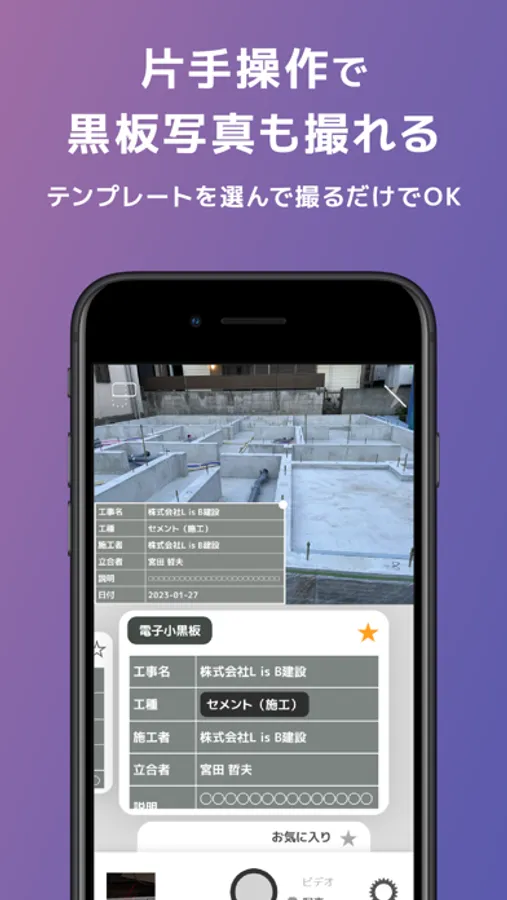 管理者は、事前に事務所で黒板情報を黒板マスターへ設定するだけなので、管理が非常に簡単です。撮影者は、現場で黒板を選んで撮影するだけなので、現場での黒板作成作業を省略できます。もちろん、撮影時に黒板内容へ文字を入力することも可能です。CSV形式で一括読み込み・書き出しできるので、複数枚の黒板を一括で管理することができます。