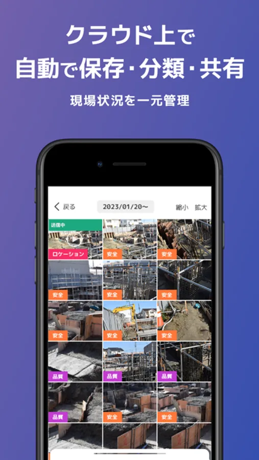 タグを選んで現場で撮影するだけで、タグ情報をもとに分類管理、クラウド上に保存できます。