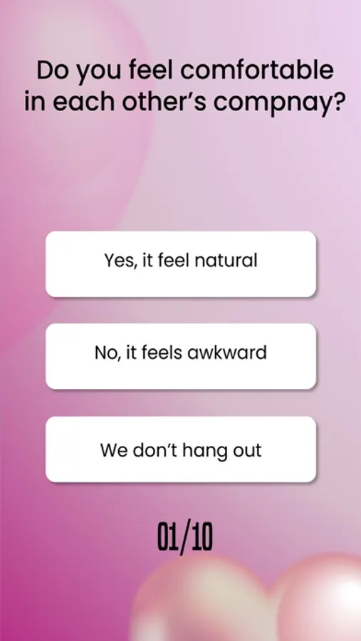 Our special algorithm will compute your love compatibility as a percentage once you respond to 10 questions. You can choose from different love test tests.