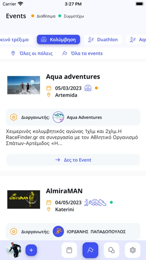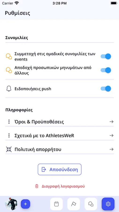 Κάθε αθλητής που δηλώνει συμμετοχή σε ένα event διοργανωτή ή meetup άλλου αθλητή, συμμετέχει στο chatroom αυτού του event/meetup και μπορεί να επικοινωνήσει με τους άλλους συμμετέχοντες ομαδικά ή με προσωπικό μήνυμα!