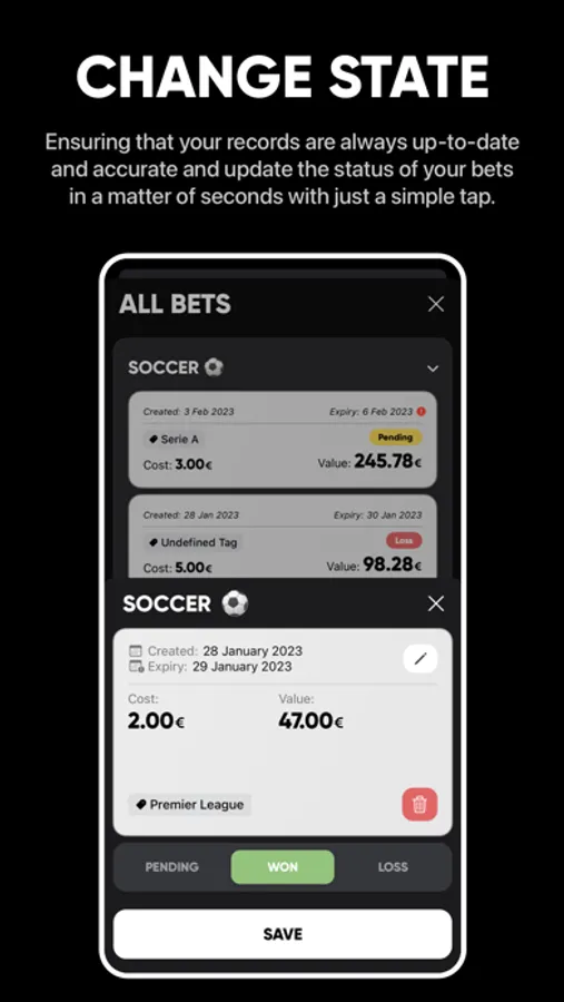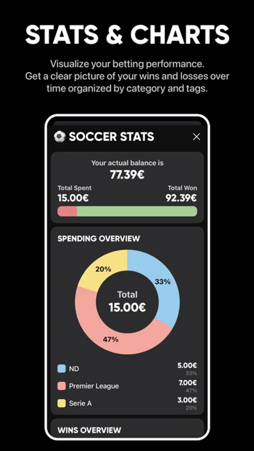 • Analyze performance with stats like ROI, win rate, profit/loss