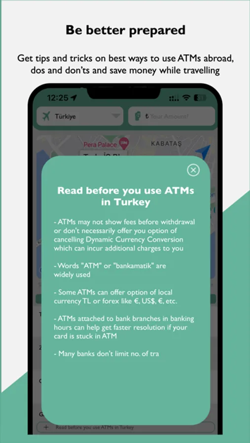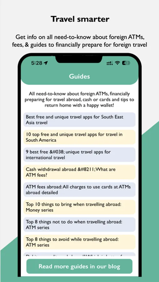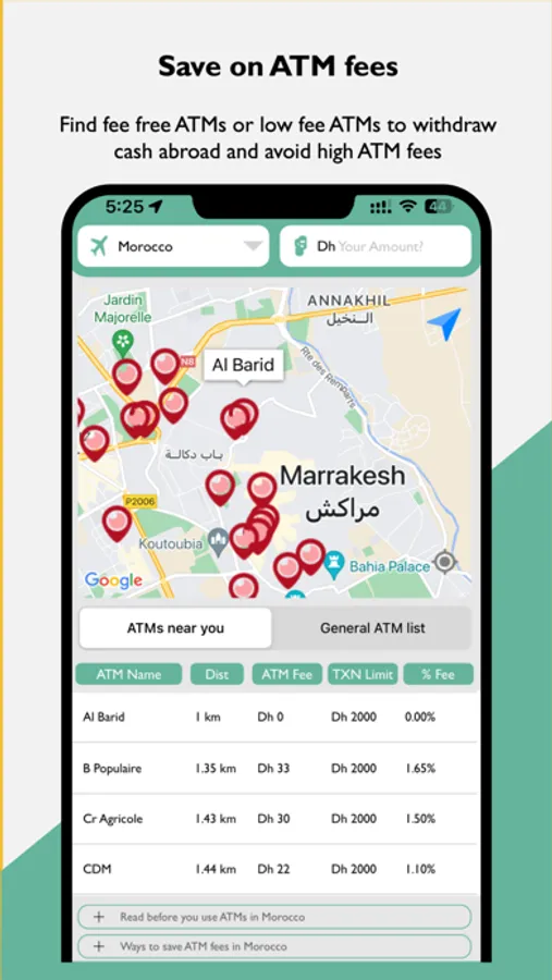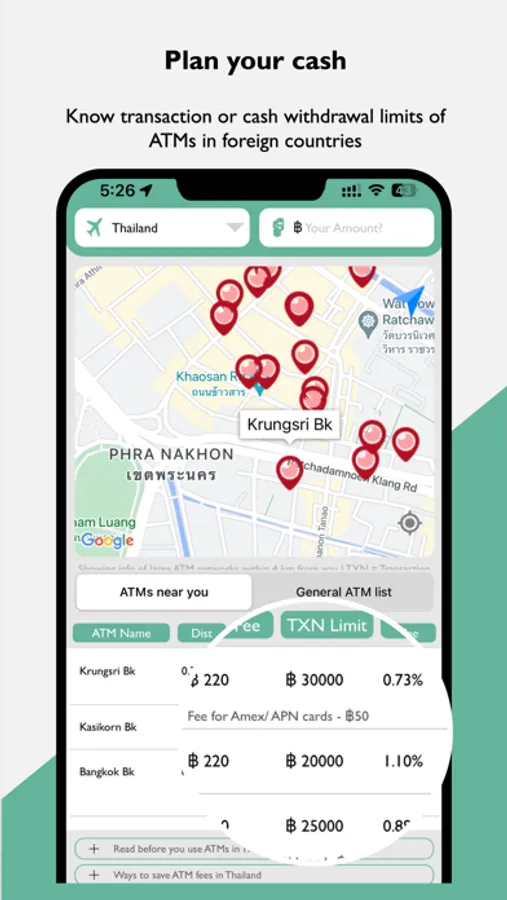 - Easy-to-read list to compare ATMs by Fees and Withdrawal Limits in foreign countries