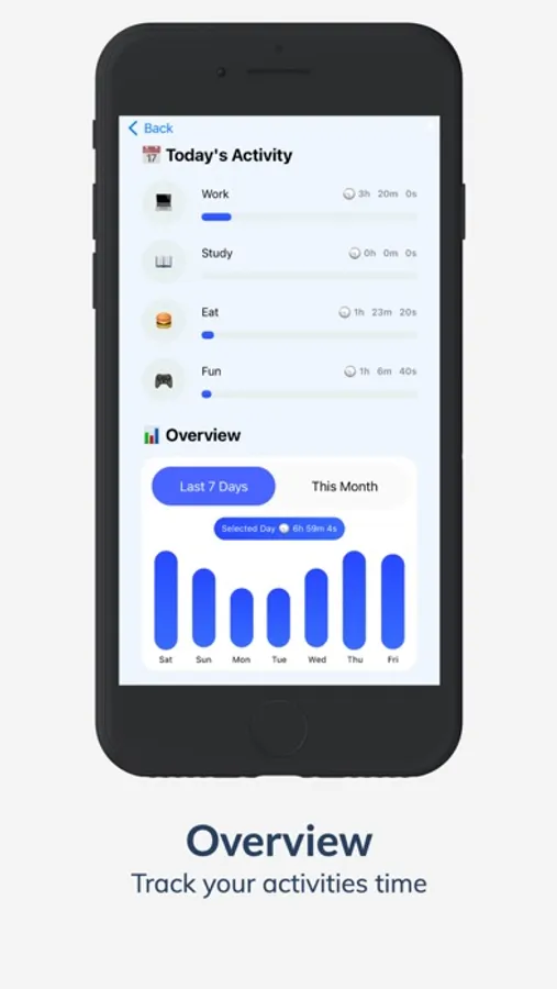 With one click you can start the activity timer or explore your activity's overview and get a report of the time spent on every activity, for the current day, last 7 days or last month.