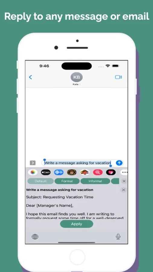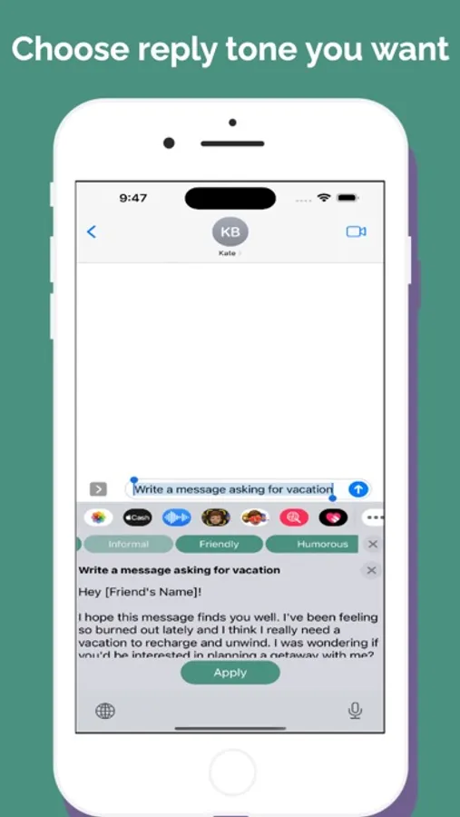 Transform your messaging experience with ReplyAssistant, the custom keyboard app that brings the power of AI to your fingertips, designed to seamlessly integrate with your iOS device.