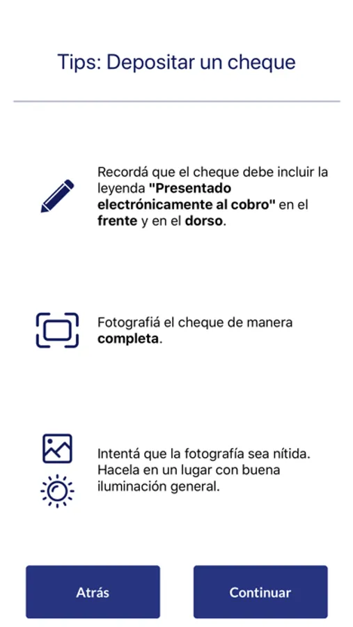 Es muy importante recordar que tendrás que escribir en tus cheques en el frente y en el dorso, la leyenda “presentado electrónicamente al cobro” antes de capturar las imágenes del valor.