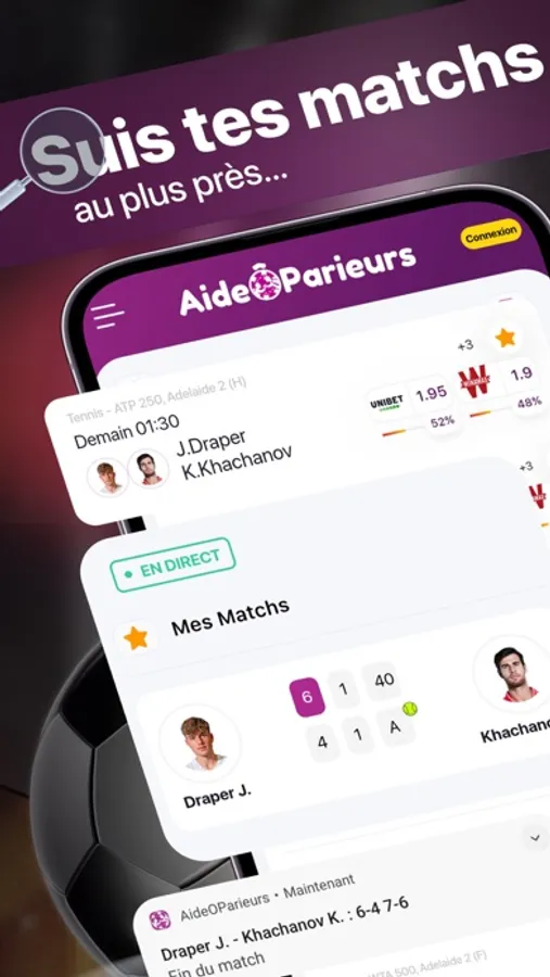 Retrouve tous les matchs de Football et Tennis. Ajoute des matchs à tes favoris, retrouve les en direct et sois alerté de leur évolution via les notifications.