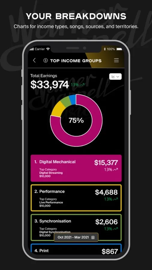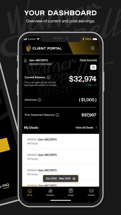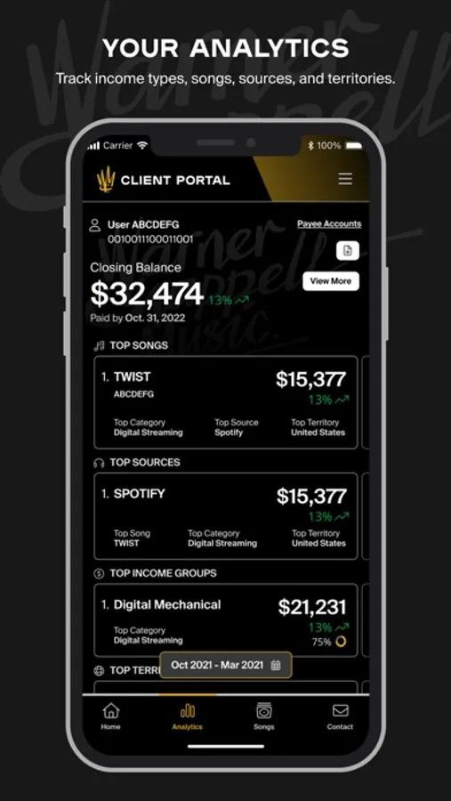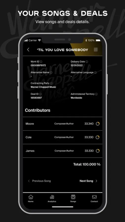 Warner Chappell Music (WCM)’s Client Portal provides songwriters and their management teams with an overview of their account and information related to deal(s), songs, royalties earned per pay period, analytics data (top songs, top sources, income types, territories) and statements.