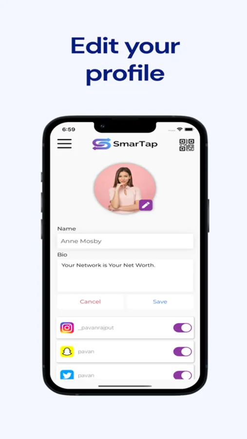 To share a profile simply tap the NFC tag to a phone having NFC or let anyone scan your in-app QR code.