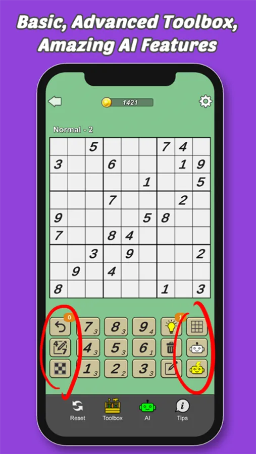 Sudoku. It comes with 6000+ Sudoku puzzles, from easy ones for beginners to the hardest puzzles that challenge world top players. It not only provides the basic functions required by professional Sudoku players, but also provides a set of advanced toolbox for Sudoku learners. What's more, it has amazing artificial intelligence to demonstrate the solution step by step. It also has a powerful AI solver that can solve any Sudoku puzzle in a flash. Have you encountered a Sudoku puzzle that you can't solve elsewhere? Give it a try!