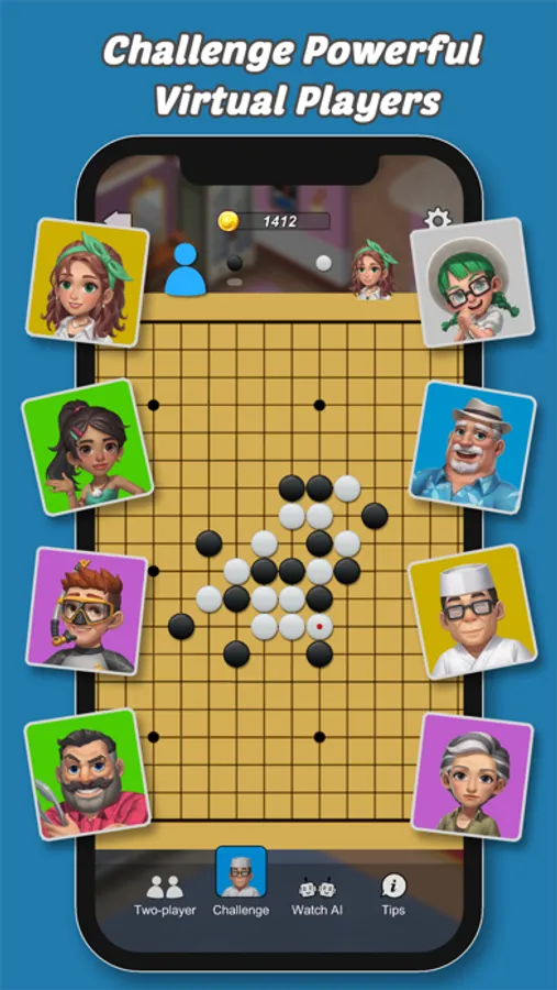 Gomoku. It includes 9 powerful AI virtual players for you to challenge. Wtih two-player mode, you can also play with your family face to face on the same screen. With watching mode, you can watch the AI play and learn from it. The graphic quality of the chess pieces is exquisite, and the sound of playing chess is very crisp and pleasant.