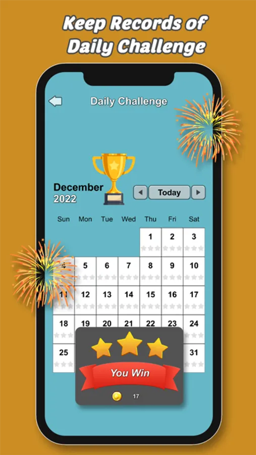 The game application comes with a calendar, it automatically records daily challenges, saved in device local storage, and displays them in the calendar. You can review your challenge record at any time. Of course, you can also erase the game data easily from settings dialog.