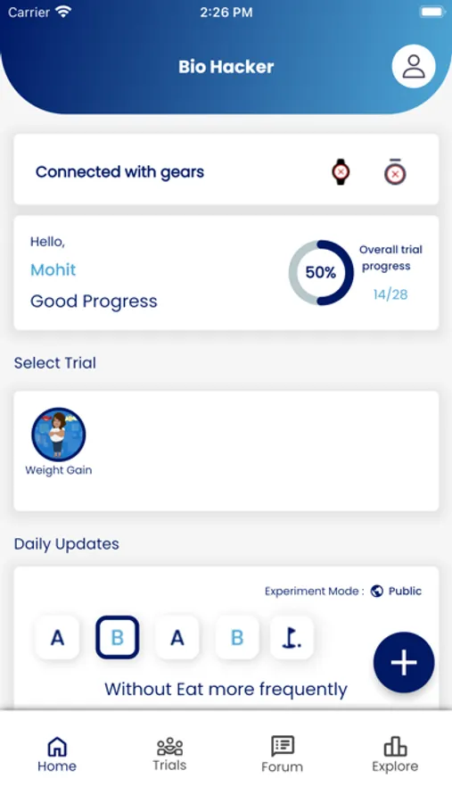 With the app, we aim to create crowdsourced science. Easy trials to setup. Share you trials to improve and strengthen the data. We utilize a trial design called n of 1 meaning number of 1. The number refers to you as the only participant. You use yourself as control by shifting between interventions and measuring the impact. Track manually metrics you set up or integrate with your FitBit devices to automatically gather data. But we expand the idea of n of 1 by letting you have others participate thereby compiling the data. Who knows, will you find the new hot intervention to keep people healthy?