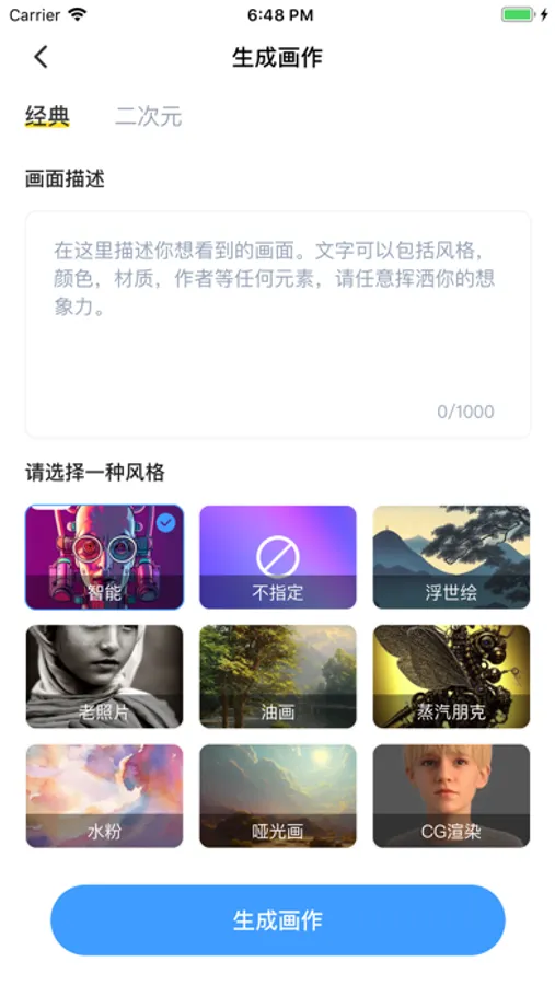 必果基于强大的AI技术,可以根据您输入的描述,在一定时间内生成各风格的画作。古风、写实风格、二次元风格、像素风格、概念艺术、未来主义、赛博朋克、巴洛克风格、卡通画、油画等都可以选择。