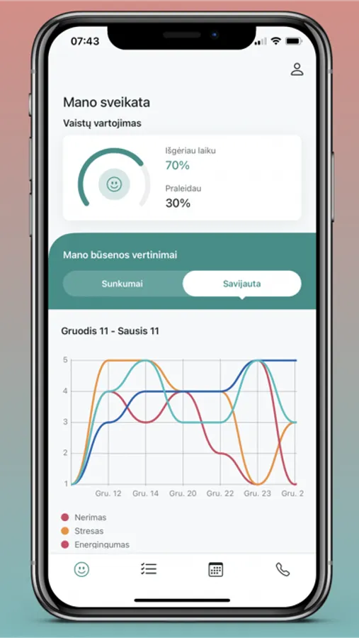 Programėlė reguliariai vartotojui pateikia aktualius klausimus apie psichologinę gerovę, psichikos sveikatos sunkumus ir kitus sveikatai reikšmingus veiksnius. Gauti savistabos rezultatai atvaizduojami paveikslėliuose – taip galima nuosekliai stebėti jų pokyčius. Atsižvelgiant į vartotojo pateiktus duomenis, programėlė teikia psichikos sveikatos specialistų parengtas rekomendacijas.