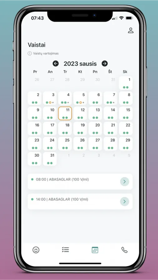 Siekiant geriau valdyti psichikos sutrikimo atkrytį, programėlė teikia priminimus apie paskirtus medikamentus. Nurodytų laiku vartotojui ateina priminimas išgerti atitinkamą vaistą. O taip pat greta pateikiama nuorodą į vartojamo vaisto informacinį lapelį – taip vartotojui yra lengvai prieinama informacija, nukreipianti į patikimą šaltinį. Vaistų vartojimas yra registruojamas: asmuo nurodo, ar vaistą suvartojo, ar ne. O ši apibendrinta informacija yra pateikiama paveikslėlyje, tokiu būdu suteikiant galimybę stebėti vaistų suvartojimą.