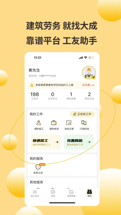 特色服务:工地招工、工地找活、记工记账、在线对工对账。