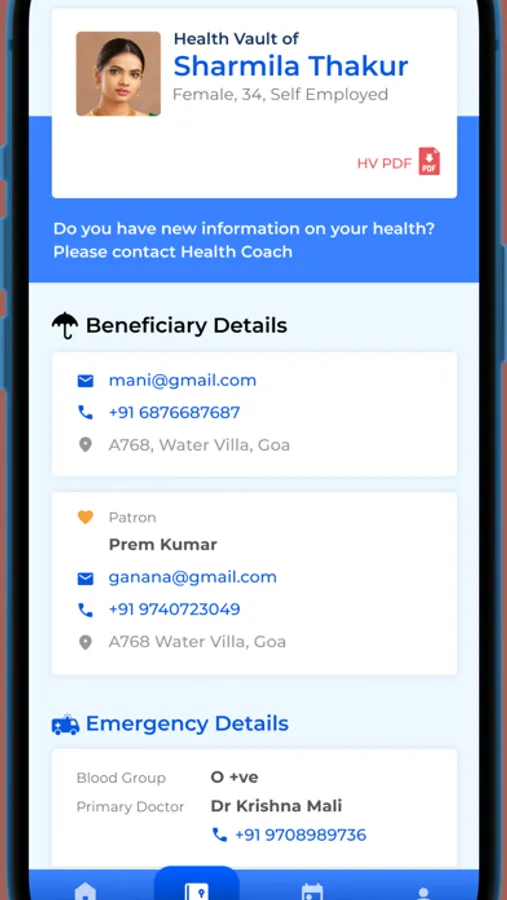 HealthVault stores all details of all medical conditions, past and present health status, current medications, and also parameters like appetite, bowel & bladder habits, etc. With anytime access available, the health vault could be life-saving in times of emergencies. The HealthVault also displays the beneficiary’s Insurance details.