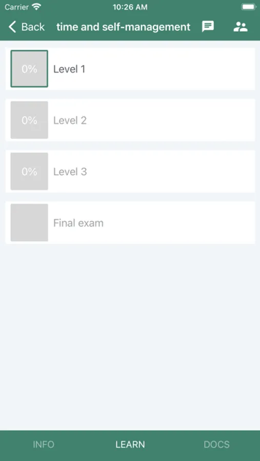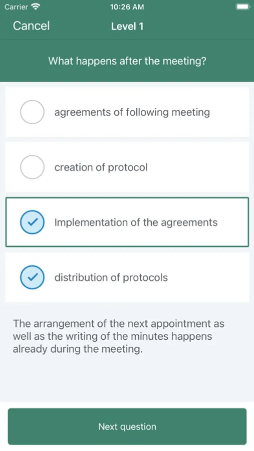 In addition to classical learning, level learning is also offered. In level learning, the questions are divided by the system into three levels and asked randomly. Between the individual levels there is a breather to save the content in the best possible way. This is necessary to achieve brain-friendly and sustainable knowledge acquisition. A final test makes the learning progress visible and shows where possible deficits lie and, if necessary, a repetition makes sense.