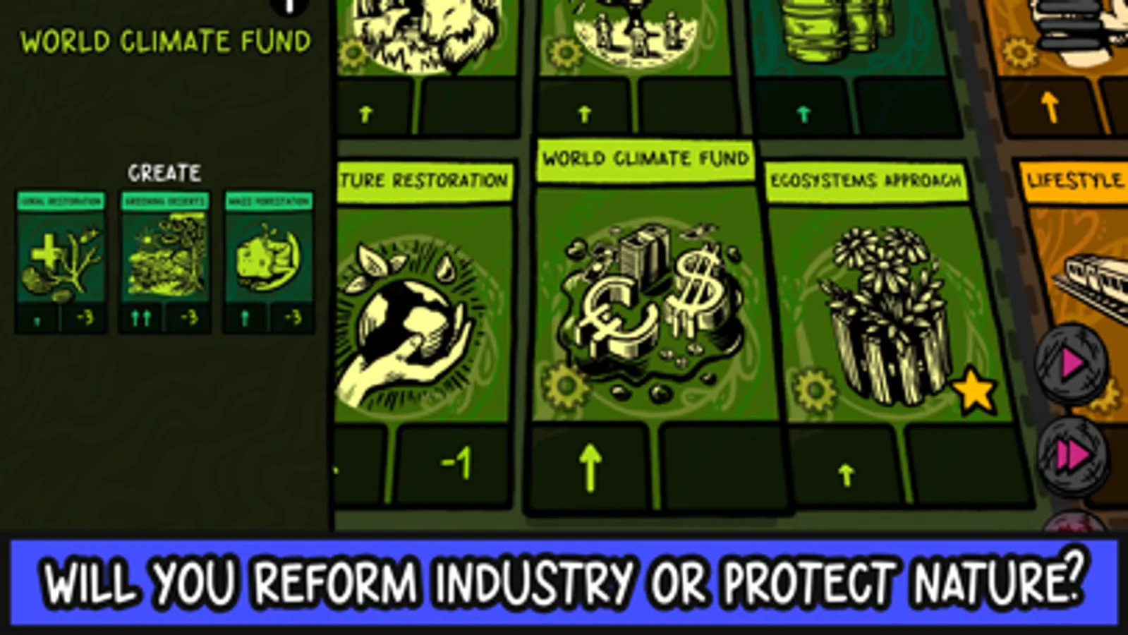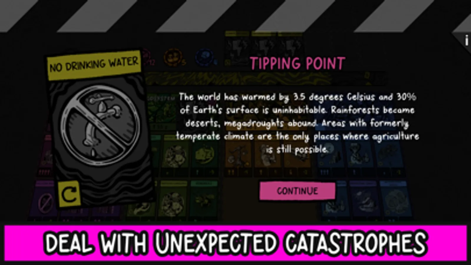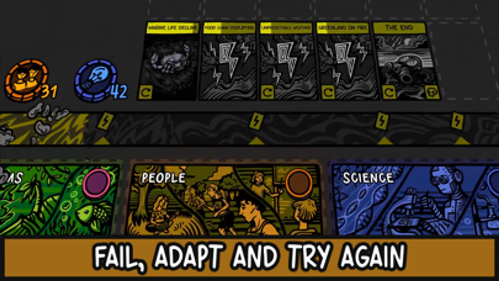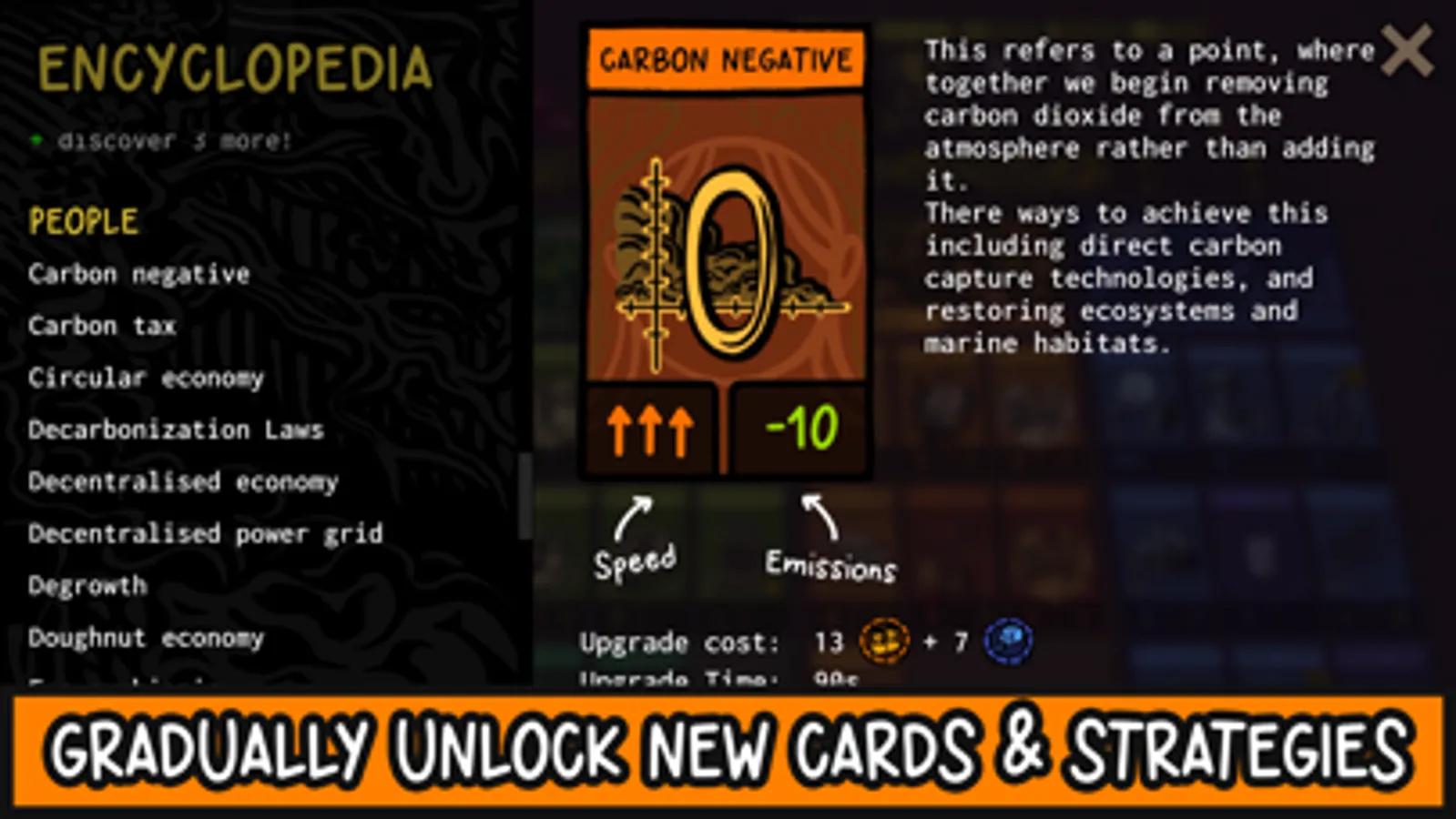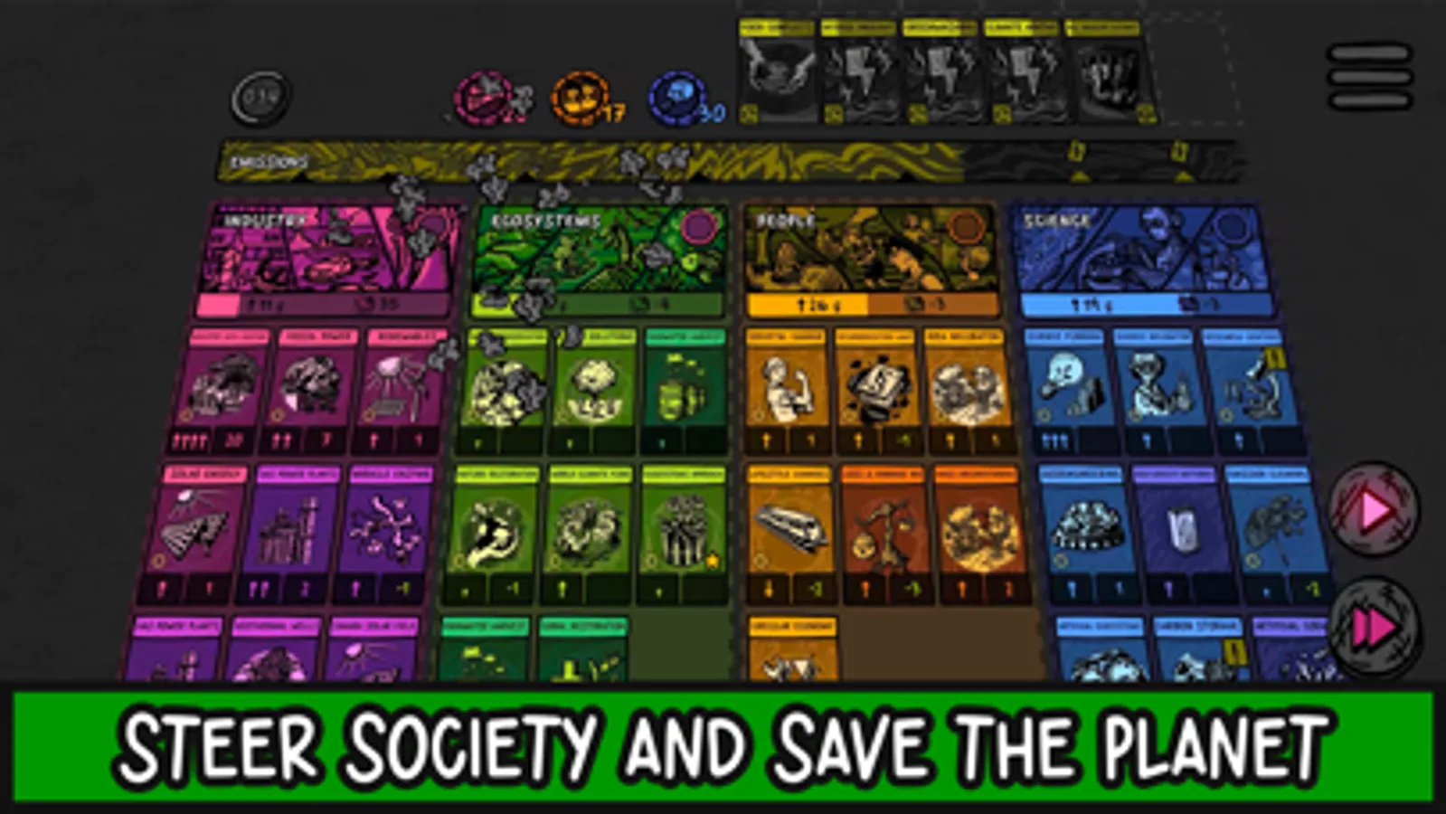 Game cards represent inventions, laws, social advancements, or industries - each designed on the basis of real-world climate science. In addition, partially randomized world events occur, forcing you to adapt your strategy. Gradually unlock new cards in the game encyclopedia and chart your path towards a new future.