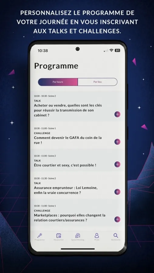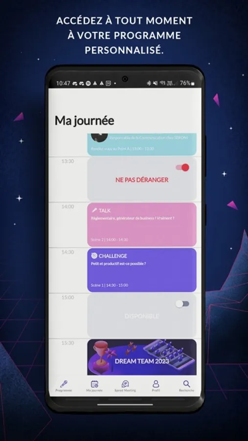 - Le programme : l’application permet d’accéder à tout moment au programme complet de la journée. Avec la fonctionnalité favoris, vous pouvez personnaliser le programme de votre journée en vous inscrivant à l’avance aux talks et challenges (en présentiel ou à distance).