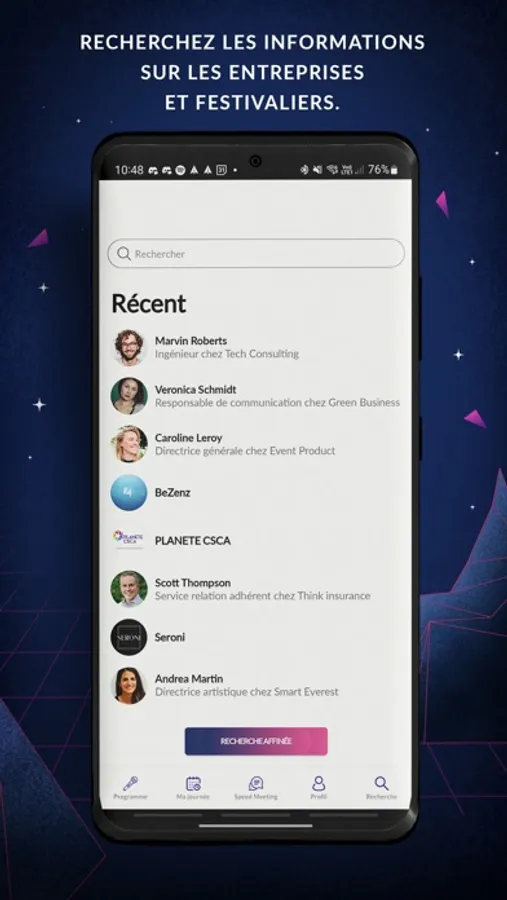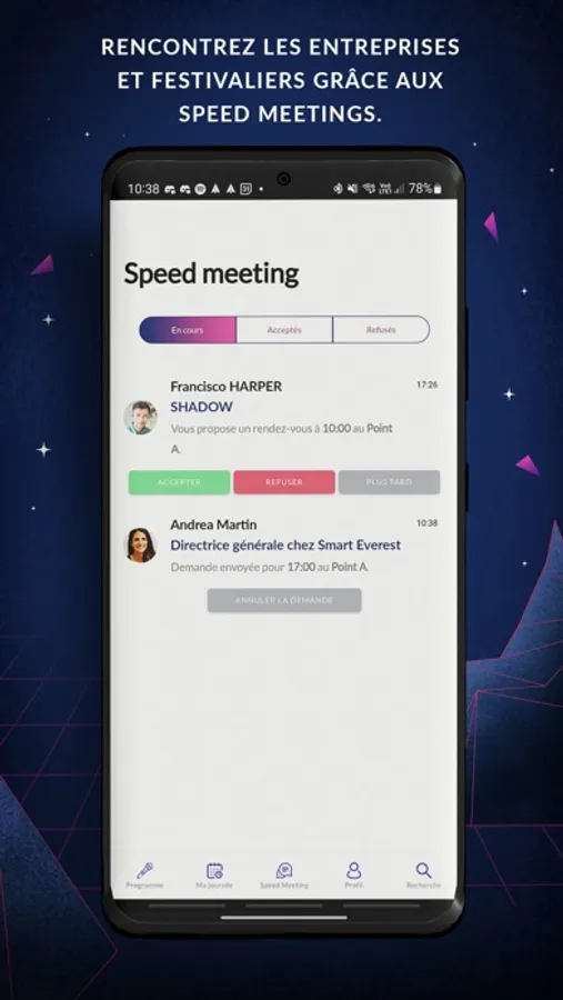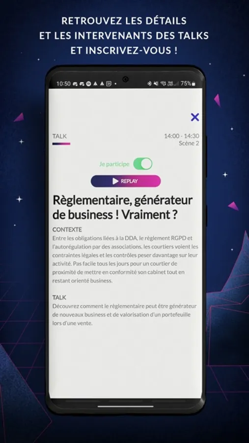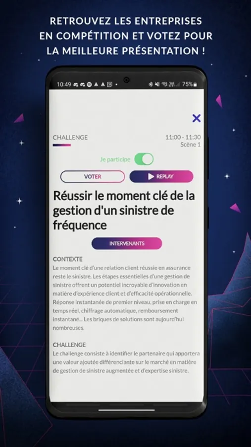 - Le distanciel : Vous n’êtes pas présent physiquement sur l’événement? Suivez à distance depuis l’application les challenges et les talks. Votez en direct lors de challenge et prenez des RDV après l’événement.
