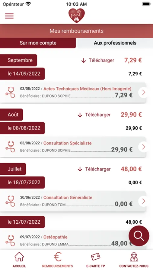 Vous pouvez consulter les remboursements des dépenses de santé de toutes les personnes rattachées à votre contrat.