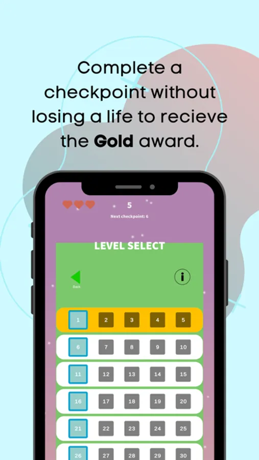 There are five levels for each checkpoint. You have three lives to complete each checkpoint!