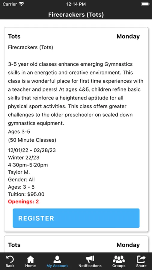The Gymnastics Revolution app allows you to easily manage your account and register for classes and special events. You'll also receive important notifications about class changes, closings, registration openings, special announcements, and upcoming events.