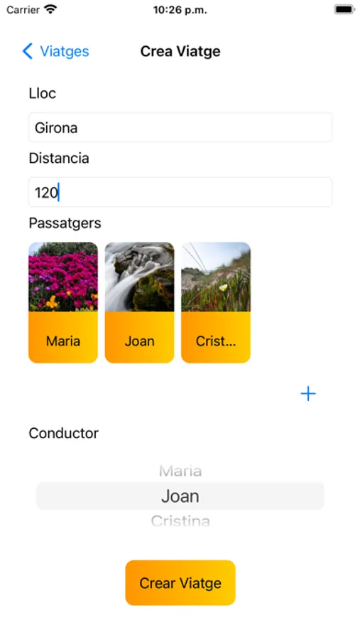 Tot seguit creem un nou viatge posant la destinació, els km del viatge. Amb un sol clic sobre la imatge dels ocupants i finalment escollir el conductor.