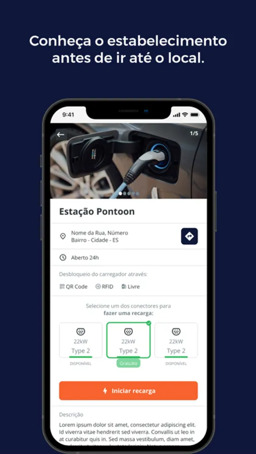 - Consultar informações sobre cada eletroposto: horário de funcionamento, disponibilidade, plugs existentes e valores de carregamento.