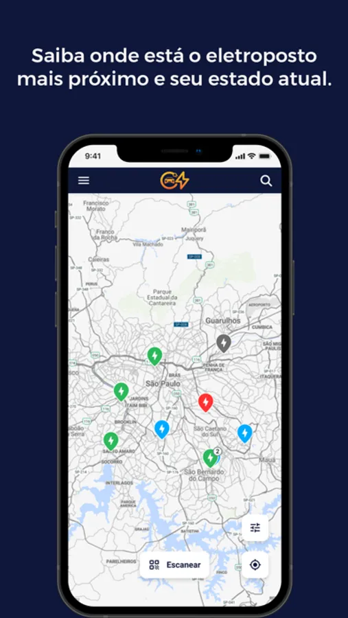 - Encontrar carregadores próximos ou em seu trajeto, através do mapa.