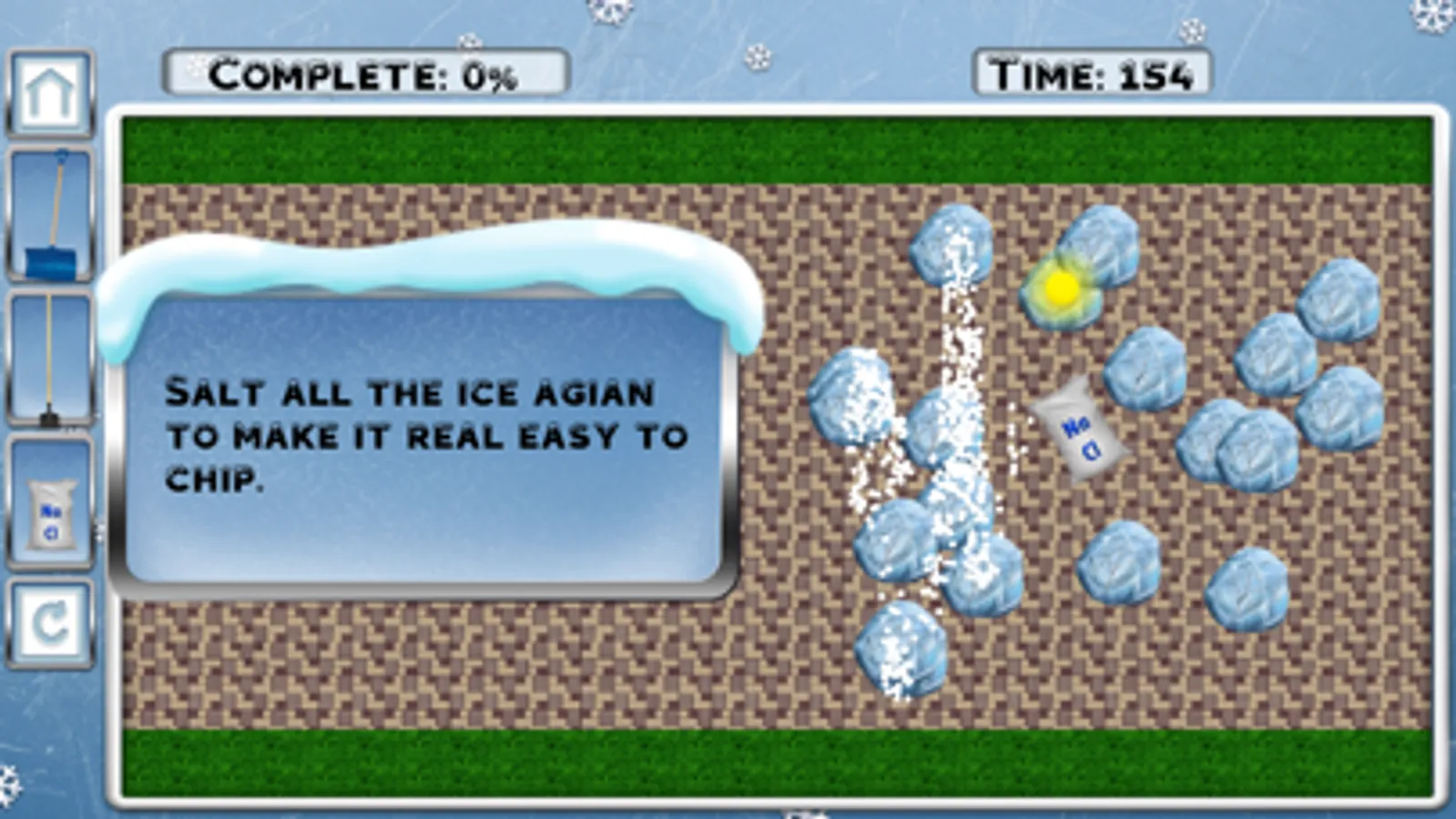 Another feature of Snow Shoveler Lite is the player will need to chip away ice that forms on the sidewalks on a warm day. Salt is first used to weaken the ice. This is very effective on the spots with thick ice. Next the ice pick can chip away all the extra pieces of ice