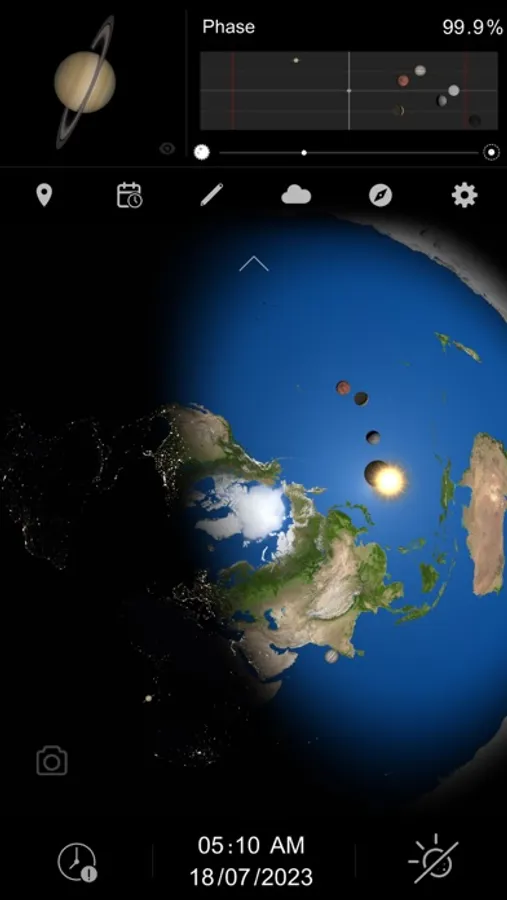 The graphical positions of the celestial bodies on the map represent the zenith (overhead) position relative to the app time. The direction of the celestial body (azimuth) in your local sky and its altitude can be visualised as well as the sky dome relative to any location through the navigation tab.