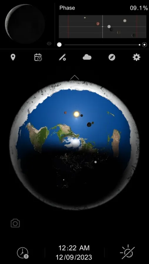Flat Earth app is a tool used to visualise daylight coverage, sun and moon overhead positions, rise and set times, moon phases, lunar parallactic angle and liberations, and much more in a simple and easy to read Azimuthal projection of the earth.