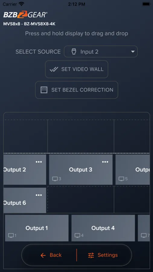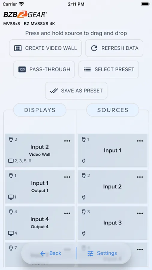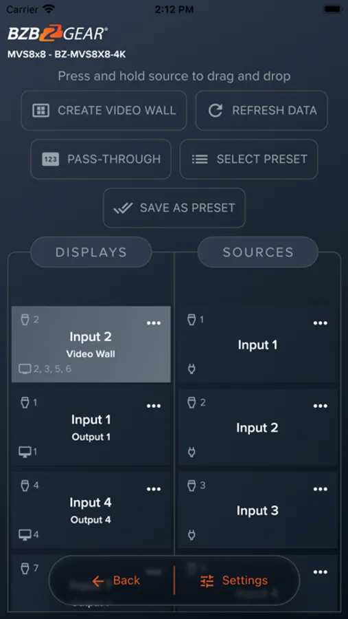 Effortlessly set which source is displayed on which device by simply dragging sources/inputs to desired outputs. The Control app allows users to change input and output device names to efficiently manage connected devices at a glance. Status indicators were added to easily show if the matrix switcher is visible to the app and to show which sources are connected and active. A Pass-Thru button allows users to easily and quickly set input-output matching (1 to 1, 2 to 2, etc). The Switch Control app also allows for a number of Preset configurations based on the users’ needs.
