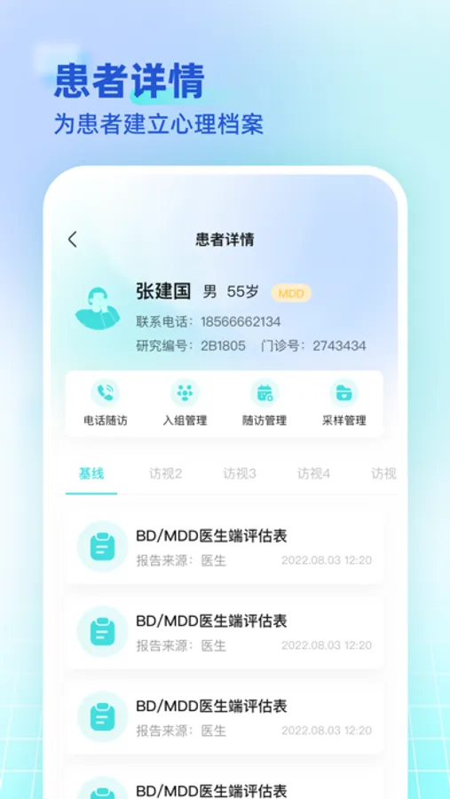 本应用主要是“精神心理”临床医生使用,方便医生使用各类评估量表工具,查看患者的入组信息和健康数据。