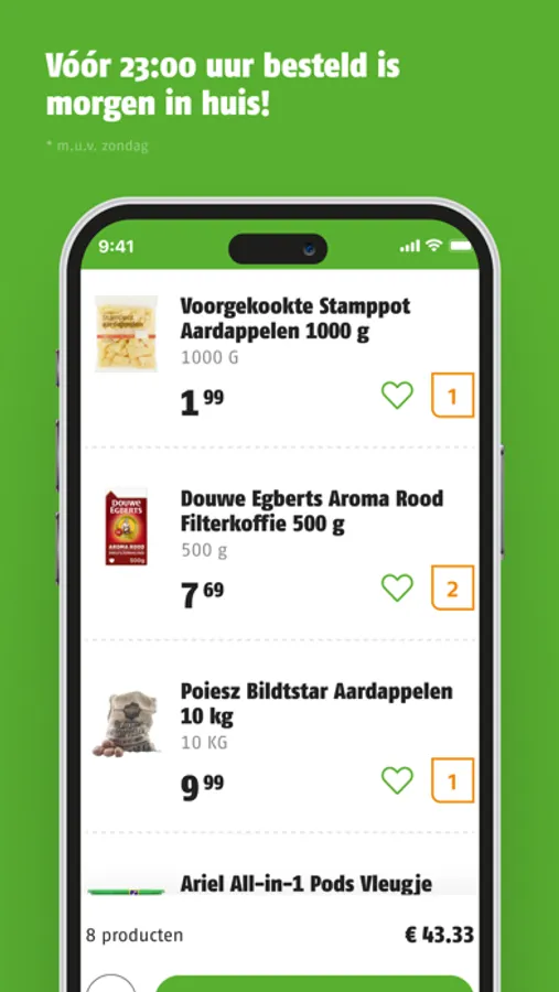 In de app kun je een favorietenlijstje aanmaken. Met dit lijstje kun je in één keer alle items toevoegen aan je winkelmandje. Handig, want zo bespaar je veel tijd.