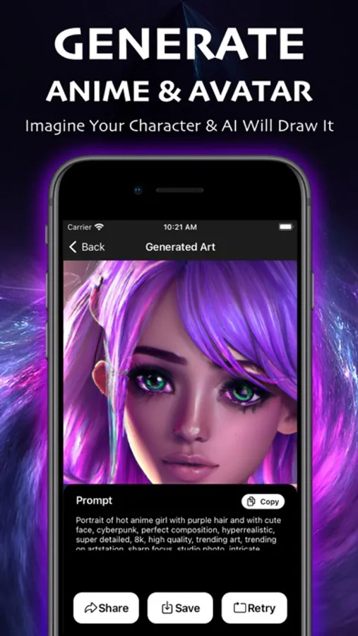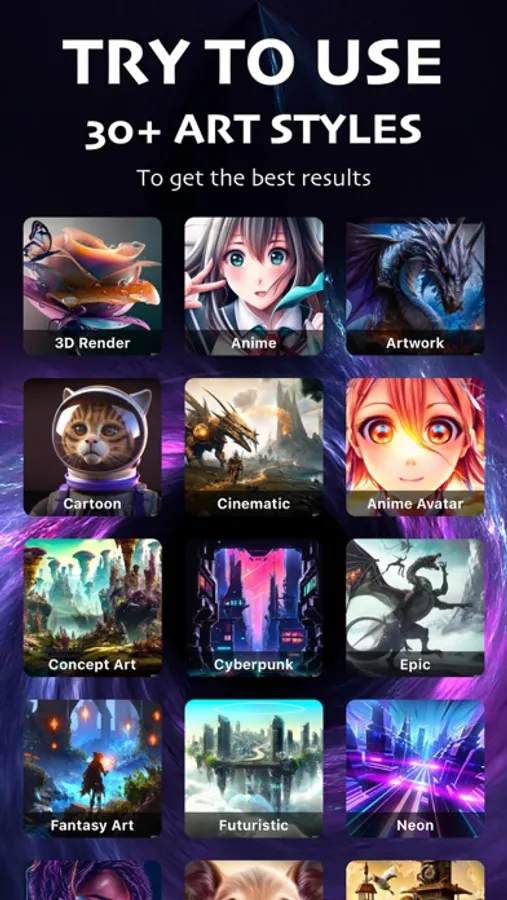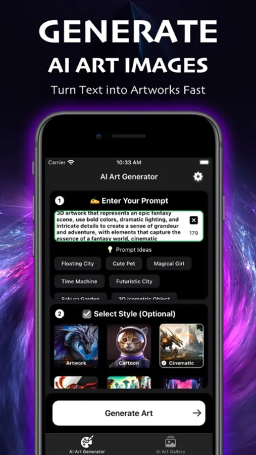 App includes a wide range of art styles to choose from, such as: 3D Render, Surreal, Anime, Portrait, Cinematic, Cyberpunk, Steampunk, Futuristic and more. Simply enter your prompt or choose any from prompt ideas and select an art style, then watch as the AI generates a unique and captivating image that will impress. But that's not all - app is designed to be user-friendly and easy to use, with a sleek and modern interface that makes generating art easily and fast.