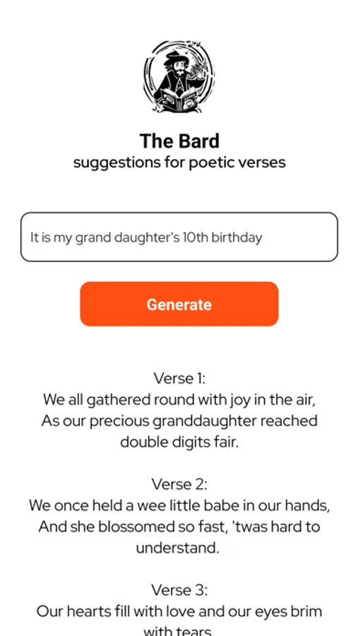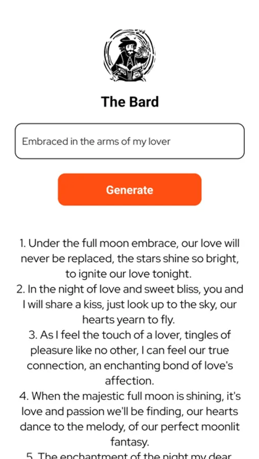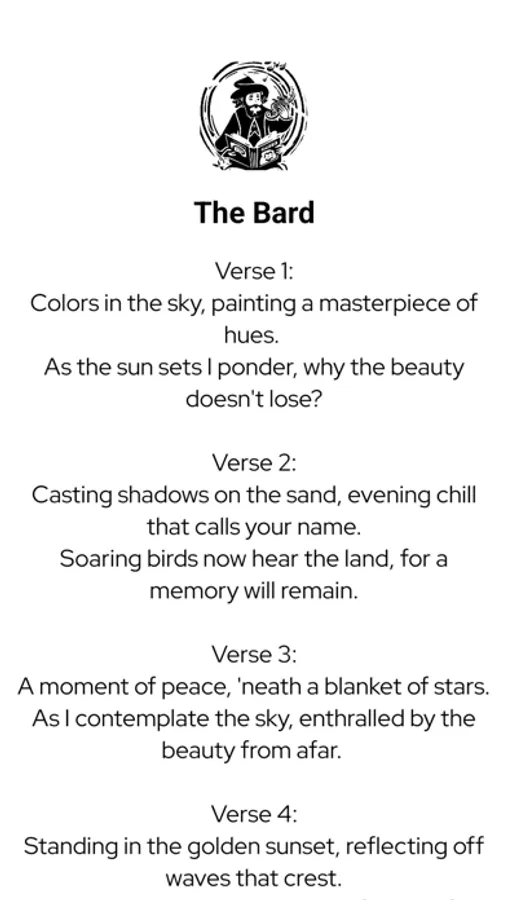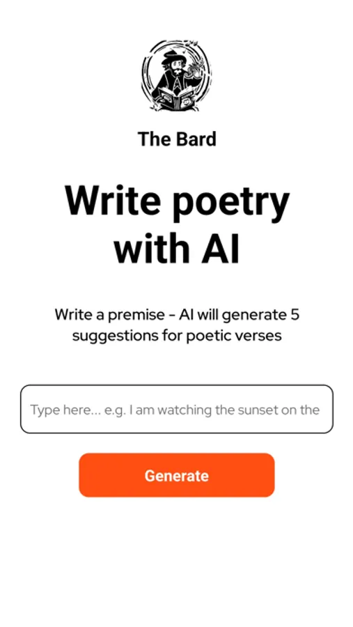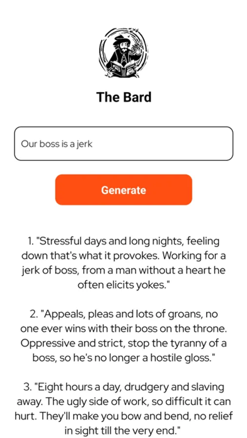 Give The Bard a premise (it can be a story, a scenario, a dream or any random words), and it will generate five poetic verses using the power of AI :))
