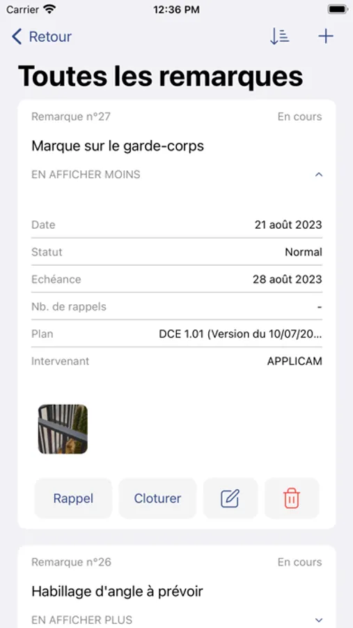 - créer de nouvelles remarques, manuellement ou à partir de plans (en précisant le niveau d’urgence ou les dates de réalisation) et les agrémenter d’une ou plusieurs photos annotées