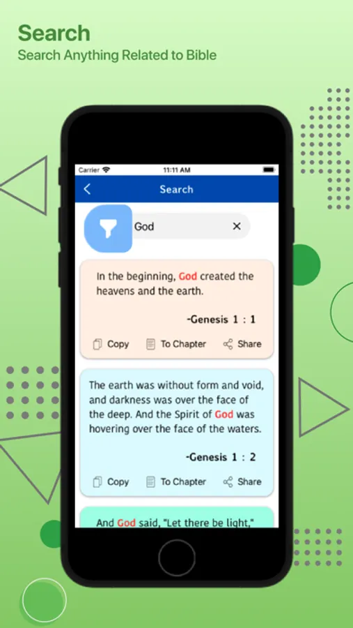 Daily Verse: Start each of your days with the random verse that appears on the Holy Bible app, where it can be copied and shared.