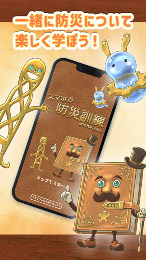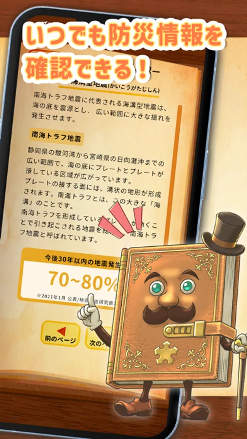 図鑑おじさん、しおりくん、ギウちゃんと共に、楽しく防災に関する知識を得ながらレベルアップを目指そう!