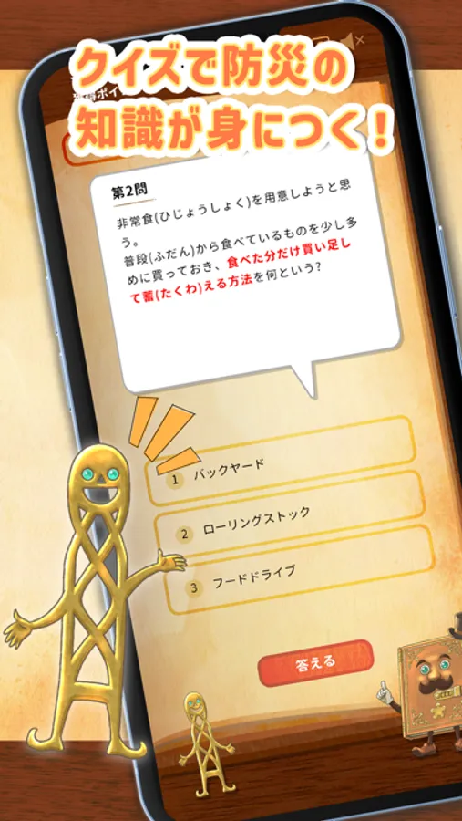 キャラクターと一緒にクイズに挑戦することで、防災について楽しく学べます。