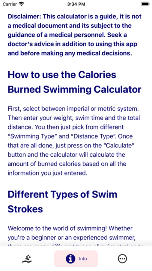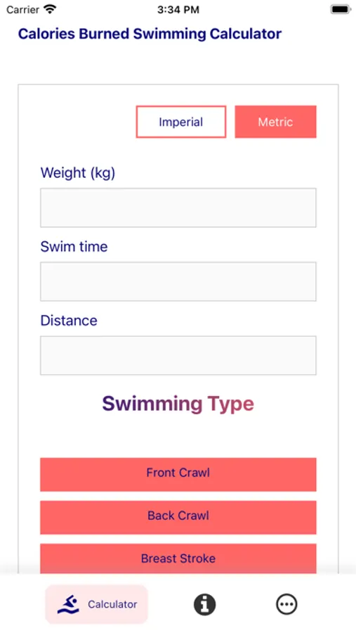 First, select between imperial or metric system. Then enter your weight, swim time and the total distance. You then just pick from different “Swimming Type” and “Distance Type”. Once that are all done, just press on the “Calculate” button and the calculator will calculate the amount of burned calories based on all the information you just entered.
