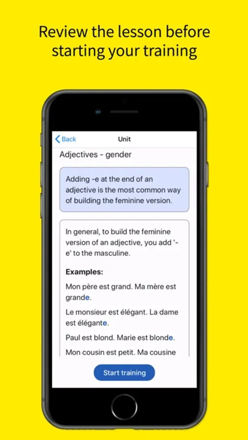 + Study and train on specific topics such as adjectives, nouns, interrogation and many more.