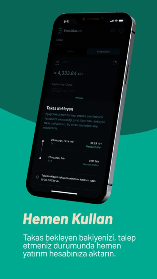 Bekleme süresi olamadan satış işlemi yaptığınız hisse senetlerinin bedellerini aynı gün içinde banka hesabınıza çekebilir, acil nakit ihtiyaçlarınızda değerlendirebilirsiniz.