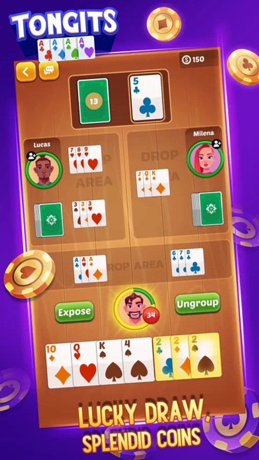 Tongits-Go is a three-player rummy card game. The Tongits-Go game starts when each player is dealt 12 cards while the dealer gets 13 and the rest of the cards are left as a central stack. The game begins when the dealer dumps a card. The next person can either pick up the disposed card if that card makes a set or adds to a set they already have or get one from the central stack. Collect hand combinations and dump unnecessary cards. The picking and discarding of cards goes on until someone wins by Tongits, calls a fight or until the central stack runs out of cards. If this happens, the players tally the points of the cards they have in hand and the one with the lowest wins.